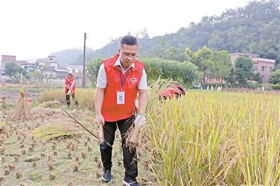 ■梁欲亮在帮蒲洞村脱贫户割稻谷。