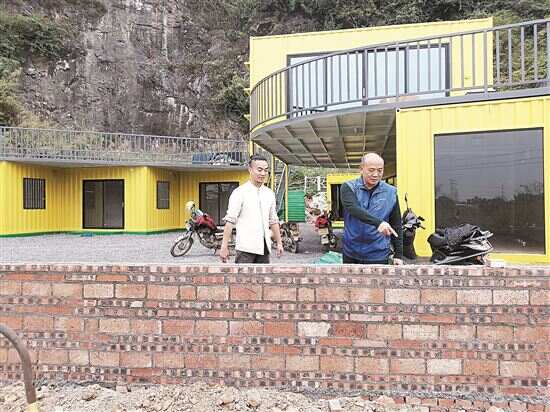■钱胜(右)在狗仔豆基地建设现场调研。