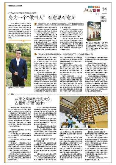 今天,我们可以怎样努力,去感染更多的人捧起书本?阅读氛围的营造,可以怎么做?如何“让书写在古籍里的文字都活起来”?在2024年读书月期间,新快报收藏周刊记者专访了南方出版传媒股份有限公司副总经理,广东人民出版社党委书记、社长肖风华。