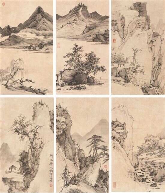 弘仁诗书皆长,更擅画山水,借传统之气以独创一格,最佳展现其遒劲笔力下悠然忘我之情。本作《擬古山水》册页十二开,绘尽山川林木的各个样貌,以崇山峻岭之壮阔舒愤解忧,以苍劲整洁、恬静淡雅的笔触道尽其豁达大度之悟。