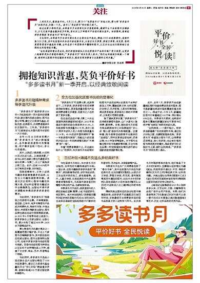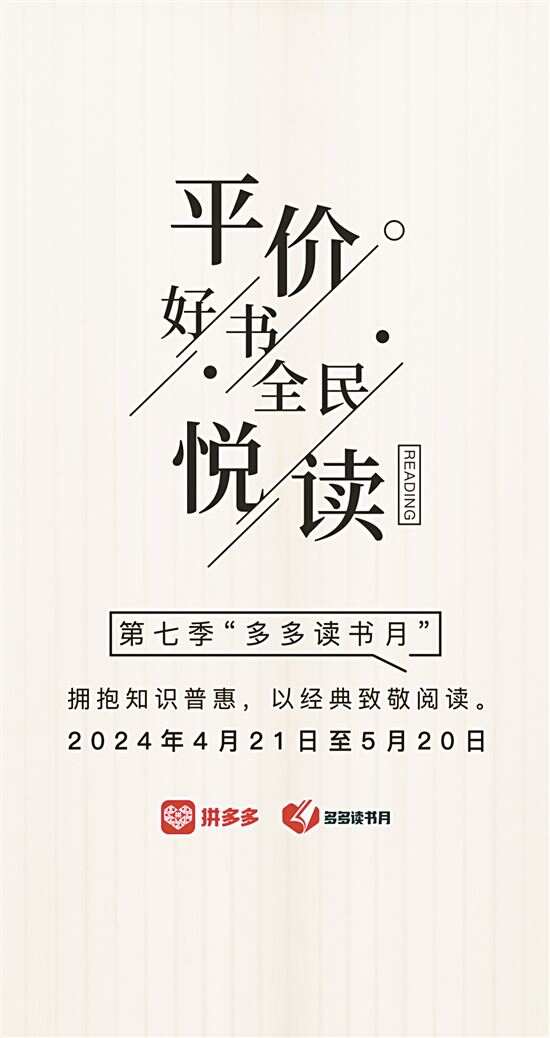 “全民阅读,一个都不能少。拼多多连接着最广泛的读者和书商,通过加大补贴力度、完善配套服务机制,‘多多读书月’希望助力图书下沉,让消费者买到便宜、放心的好货;也让有价值的图书得到更好的曝光,推动更多平价正版好书上架,践行全民阅读。”“多多读书月”项目负责人表示。
