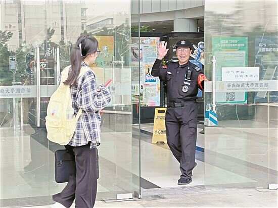 “你好!”“早上好!”“加油!好好学!”早晨8点,华南师范大学大学城校区图书馆的保安刘国连打开图书馆大门,微笑着和学生打招呼,迎接他们进馆……