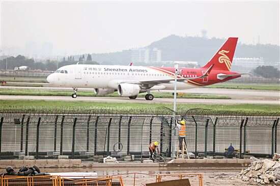 ■2023年5月10日,广州白云国际机场三期扩建工程施工现场,工人正在进行护栏的围蔽搭建。