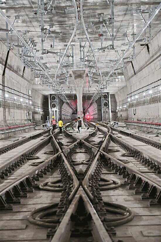 ■2021年9月20日,中铁十一局的工人在18号线番禺广场站咽喉区检查道岔调试情况。王荃荃/摄