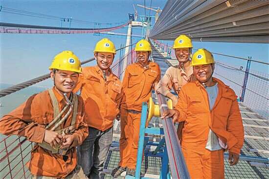 ■2022年9月3日,来自四川凉山的彝族年轻工人们在深中通道伶仃洋大桥主塔上合影留念,为能参与世界级超级工程建设倍感自豪。