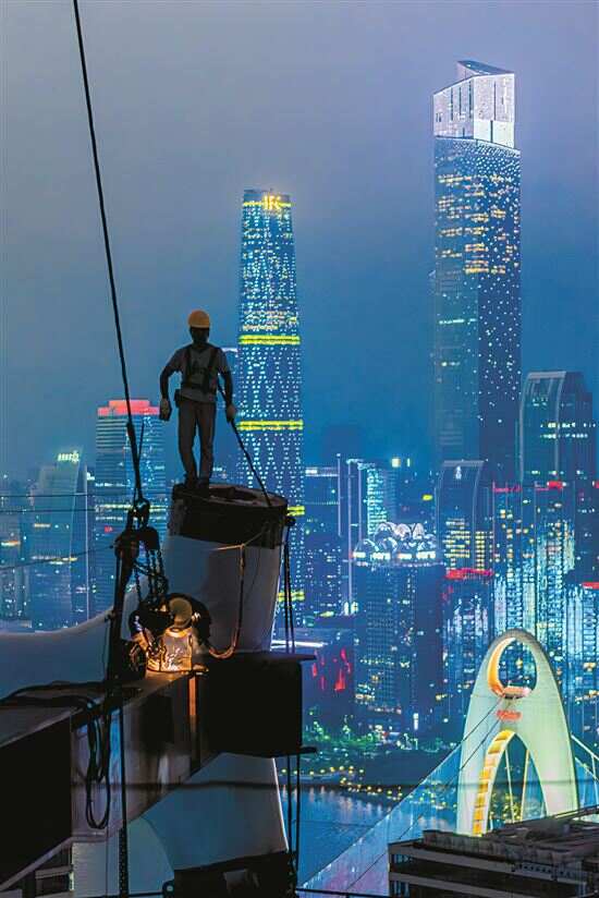■2023年6月4日,广州市海珠区琶洲人工智能与数字经济试验区一座座数字经济的龙头企业大楼拔地而起,建设现场如火如荼,对岸是广州新中轴线五彩缤纷的珠江新城,夜幕下高空建设者,用汗水换来城市高楼耸立。邱新生/摄