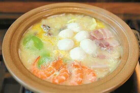 传统腌笃鲜的食材基本上是咸肉、百叶结、排骨、火腿,宴江南的一品腌笃鲜在此基础上增加了海鲜类食材,一个是手打鱼丸,用重量三斤半左右的鲢鱼制作;另一个是新鲜沙虾,这两样食材一添加进去,这一锅汤“鲜”的滋味更加被提吊出来,咸、鲜、香都出自食材的本味。