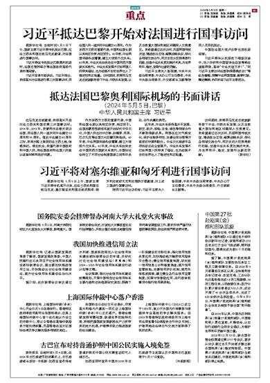 据新华社电 当地时间5月5日下午,国家主席习近平乘专机抵达巴黎,应法兰西共和国总统马克龙邀请,对法国进行国事访问。