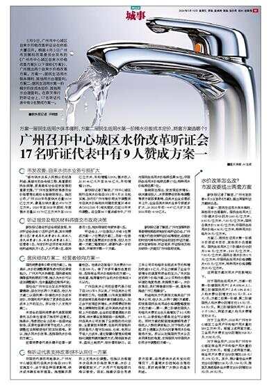 5月9日,广州市中心城区自来水价格改革听证会在府前大厦召开。根据4月3日广州市发展和改革委员会发布的《广州市中心城区自来水价格改革方案》(以下简称《方案》),广州提出两个自来水价格改革方案。方案一:居民生活用水保本微利、其他用水合理盈利;方案二:居民生活用水第一阶梯水价按成本定价、其他用水合理盈利。在昨天举行的听证会上,17名听证代表中有9名赞成方案一。