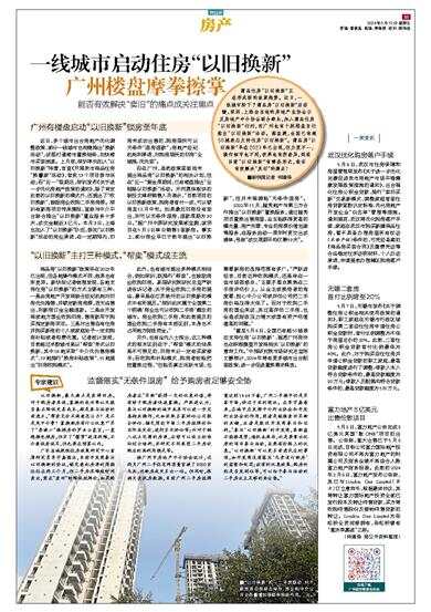 而在广州,虽然政策层面尚未提出商品房“以旧换新”的相关计划,但在“五一”黄金周期间,已有楼盘推出“全链路以旧换新”活动。天河奥体板块的联投文津府销售人员表示,“目前项目的以旧换新政策,购房者首付一成,可以锁房至12月中旬。如果最后旧房没有卖出,则可以无条件退房,退款周期为30日。”据广州中原研究发展部监测,该项目在5月2日单日销售8套新房。事实上,部分房企早已于前年提出“以旧换新”,但并未强调能“无条件退房”。 2022年11月,越秀地产与第三方合作推出“以旧换新”置换服务,通过越秀项目置换出售房屋,业主能获得更高的曝光量、房产托管、专业的房源价值包装等服务,在服务启动一周年时更交出成绩单,号称“成交周期平均仅需59天”。