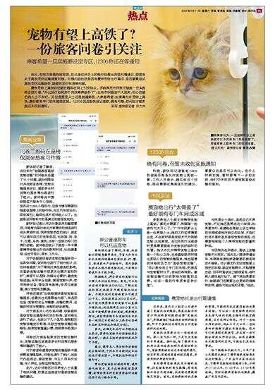 携带宠物上高铁的话题也随即在网上引发热议。多数养宠市民表示措施一旦实施将会很方便,“外出旅行和探亲不用找寄养服务了”;也有市民直言不大现实,担心怕猫怕狗人士不友好。无论是爱宠人士还是普通乘客,大家都希望,如果真允许宠物上高铁,最好能有专门的车厢或区域。12306回应新快报记者称,确有问卷,但何时才能实施还未收到通知。采写:新快报记者 许力夫
