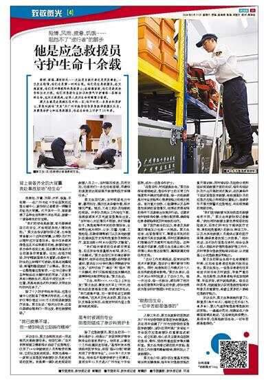 梁文生就是这英雄队伍中的一员,他平时是一名急诊科男护士,紧急时刻他“变身”为广州市烧伤创伤紧急医学救援队队员,身兼急诊护士和应急救援员,他在生命线上守护了14年多。