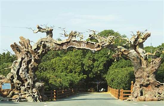 贡园入口处的树干造型拱门,先声夺人。只见左右两侧各伸出虬枝,如双臂盘曲而上,隔空舒展至门楣处相交合拢,宛若游龙环绕,游人至此,无不惊叹于“龙门”的沧桑之美。