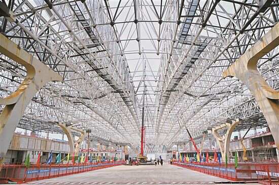 本次合拢提升的主楼钢屋盖结构东西方向最大长度约435米,南北方向长度约573米,最大建筑高度达42.95米,钢结构投影面积达11.8万平方米,相当于16个标准足球场,由8.2万根杆件、1.8万个焊接球拼装而成,总用钢量近1.83万吨,平均提升速度6~8米/小时。