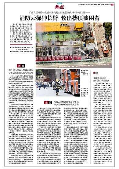 多人聚于楼顶求救,火灾现场黑烟滚滚。千钧一发之际,消防人员升起云梯实施救援,这是5月16日上午发生的惊险一幕,火灾地点位于广州市荔湾区人民南路一批发市场。