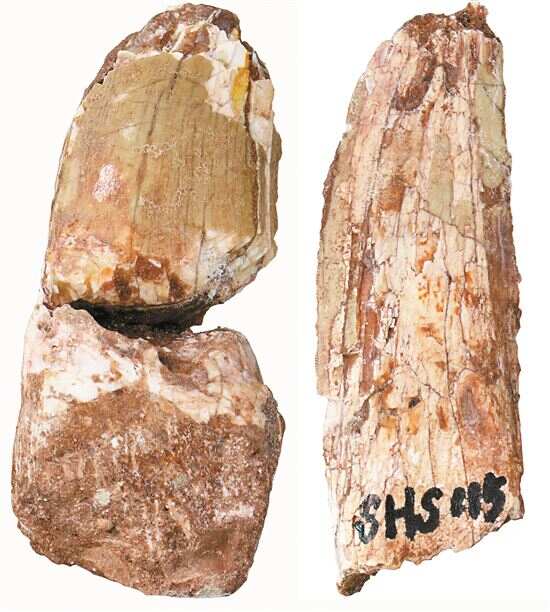 研究人员介绍,大部分兽脚类恐龙牙齿呈月牙状或香蕉状,中间宽并向两边收敛,收敛的末端形成隆突。此次发现的牙齿中有3枚发现于四会市,牙齿相对完整,牙冠长度均超过6厘米,另外一枚发现于广州市,为3.3厘米长的牙齿碎片。所有牙齿具有一致的形态特征,包括牙齿边缘有锯齿、锯齿密度较低、牙釉质光滑等,符合暴龙超科的牙齿特征。
