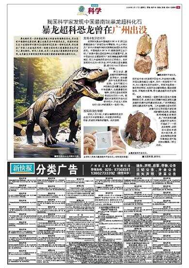 据悉,华南地区一直鲜见晚白垩世大型兽脚类的记录,此前仅在江西赣州地区发现过暴龙超科的虔州龙和暴龙类足迹,广东河源地区发现过暴龙类牙齿等。三水盆地晚白垩世的恐龙蛋化石记录还显示该区域活跃着伤齿龙类、窃蛋龙类和鸭嘴龙类等恐龙。“本次发现的暴龙超科牙齿和它们组成了一个恐龙生物群,说明在白垩纪末期的大绝灭前,恐龙生物群在我国华南地区很可能还相当繁荣。”邢立达说。