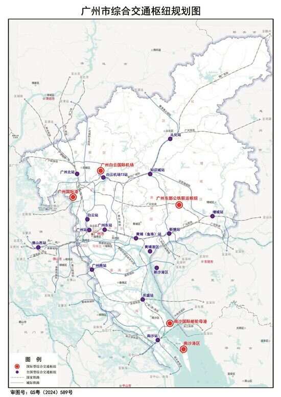 国际型综合交通枢纽:广州白云国际机场、广州港南沙港区(含南沙港物流基地)、南沙国际邮轮母港、广州国际港、广州东部公铁联运枢纽。