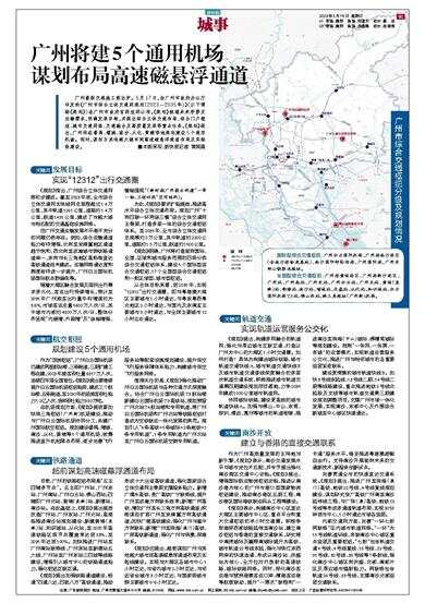 广州最新交通施工图出炉。5月17日,由广州市政府办公厅印发的《广州市综合立体交通网规划(2023-2035年)》(以下简称《规划》)在广州市政府官网挂网公布。《规划》梳理未来形势及运输需求,明确发展目标,并提出综合立体交通布局、综合门户枢纽、城市交通网络、交通融合及高质量发展等重点任务。《规划》提出,广州将在番禺、增城、南沙、从化、黄埔等地规划建设5个通用机场。同时,谋划与其他超大城市间高速磁悬浮通道布局及实验线建设。