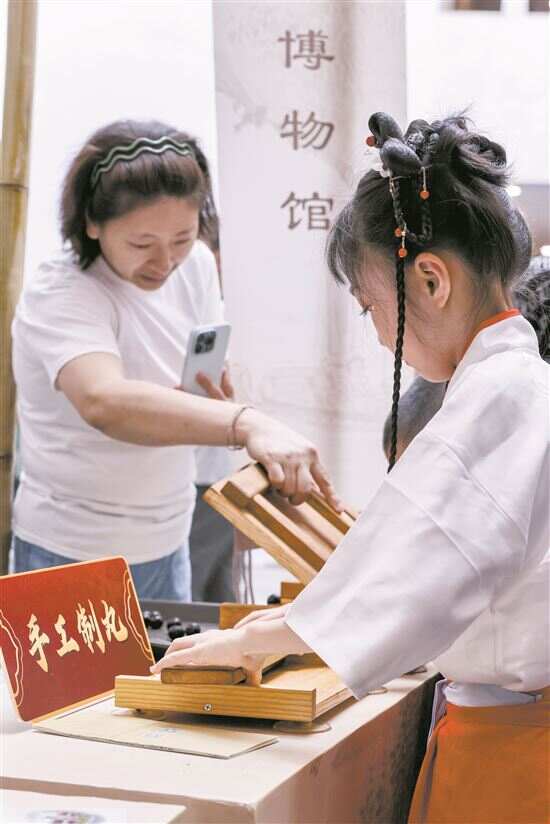 游走在小镇中,可以穿梭于街巷之间,体验汉服换装、手工艺制作、趣味游戏,如广州艺术博物院的“古韵今风” 青绿小景制作、“寻古之美”插画填色,广州博物馆的“穿粤记”桌游现场互动体验,南越王博物院的“南越工坊”漆画、滚章手工体验;也可进入烽火岁月、革命年代,参与名人、党史知识有奖问答,进行桌游互动;还可在“穿越隧道”中操作数字互动体验装置,“足不出户”打卡远程文博景点。新颖的活动设计让文物“活”了起来,众多参与其中的游客热情高涨。