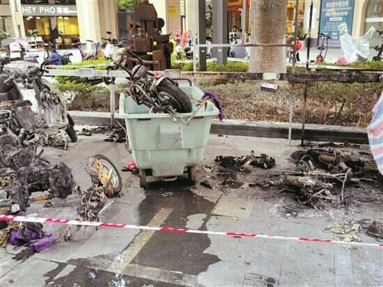 当天14时,新快报记者来到火灾地点附近,发现现场已围起警戒线,充电棚的棚顶、栏杆和充电插头等被烧坏,6辆电动自行车被烧毁,充电棚上的部分树叶被烧黑,空气中弥漫着一股烧焦的气味。