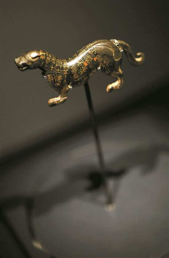 据介绍,秦汉馆现阶段展出1500余件文物,其中90%是首次展出。金怪兽、杜虎符、鎏金铜蚕等珍贵文物在秦汉馆与游客见面。