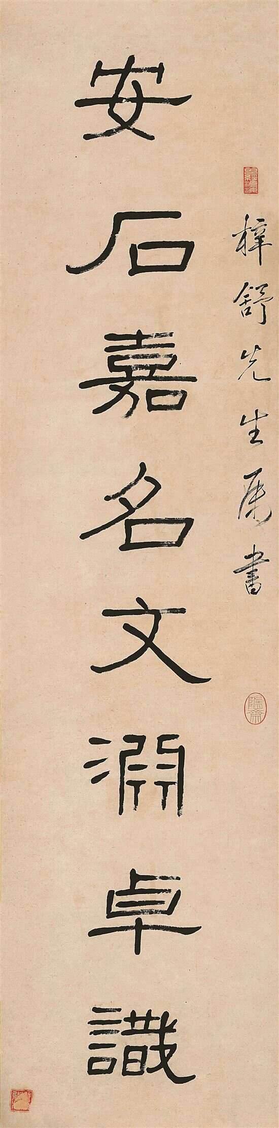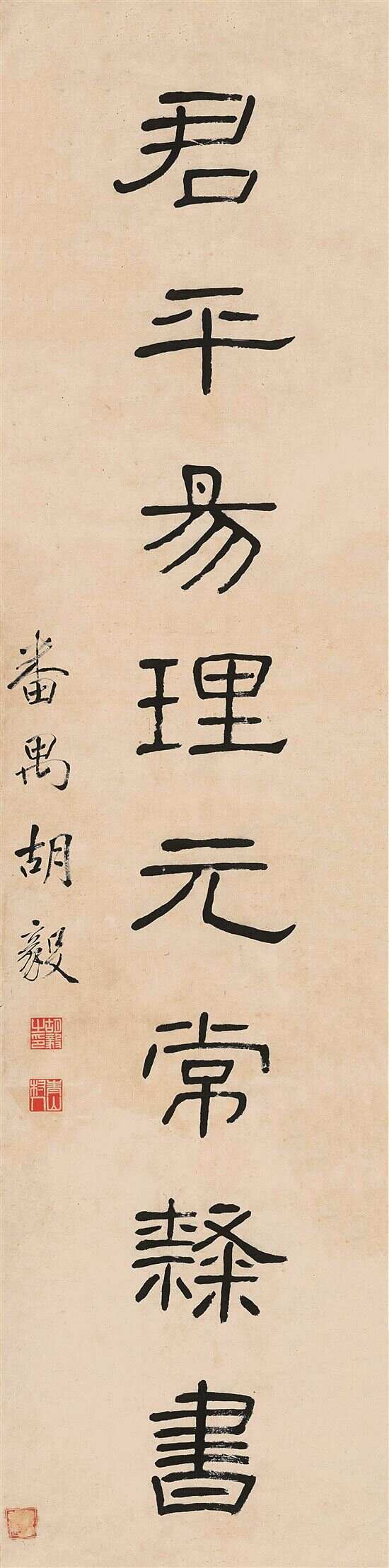 胡毅生的隶书三者兼之。其中隶书题《抗战流民图》册页(中山图书馆藏),是方整、流丽的一路;而其“安石嘉名文渊卓识,君平易理元常隶书”八言联(若虚斋藏)则属奇古的一路。此联为纸本,每联纵180厘米、横44厘米,上联:“梓舒先生属书” 引首“曾经沧海”白文印,腰章钤:“隋斋”椭圆形朱文印。下联:“番禺胡毅”,下钤:“胡毅之印”“青山村人”白文印。“曾经沧海”印文,语出唐代诗人元稹《离思五首》其四的首句:“曾经沧海难为水”之前四字,比喻他矢志追随孙中山先生从事革命的一生。“青山村人”印文,指其出生于油田镇青山村。内容是出自近人秦文锦将汉碑《石门颂》集字成联的(艺苑真赏社本),联语请名家名人撰写,有余樾、叶尔恺、李瑞清、曹元忠等,可谓书法文辞珠联璧合,相得益彰,成为习隶的好范本。“君平”,汉高士严遵的字。隐居不仕,曾卖卜于成都。“易理”指源于《易经》的学说,简称“易学”。“元常隶书”,是指钟繇的隶书。