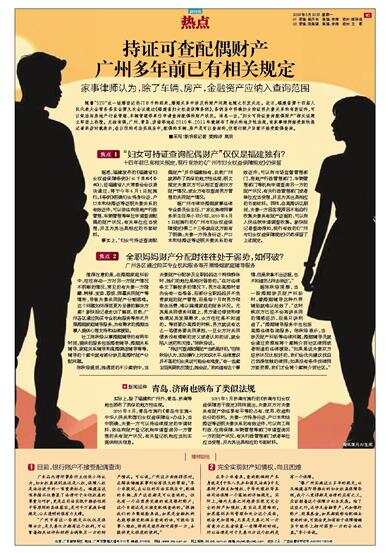 据广州市律协婚姻家事法律专业委员会主任、广东五美律师事务所主任李小非介绍,2010年6月1日起施行的《广州市妇女权益保障规定》第二十三条就在这方面有了明确:夫妻一方持身份证、户口本和结婚证等证明夫妻关系的有效证件,可以向市场监督管理部门、房地产行政管理部门、车辆管理部门等机构申请查询另一方的财产状况,有关行政管理部门或者单位应当受理,并且为其出具相应的书面材料。同样,在离婚诉讼期间,夫妻一方因客观原因不能自行收集夫妻共有财产证据的,可以向人民法院申请调查收集。新快报记者查询得知,现行有效的《广州市妇女权益保障规定》仍然保留了上述规定。