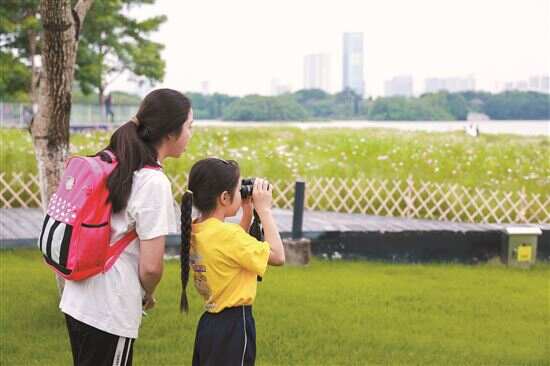 ■家长带着孩子通过观鸟了解生物多样性。 通讯员供图