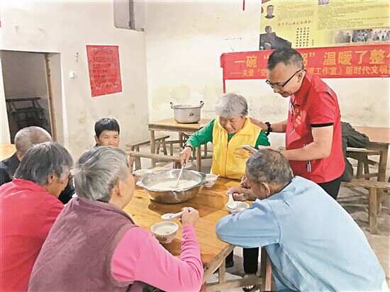 清晨6时,薄雾还笼罩在湖面,屋顶上已经飘起缕缕淡白的炊烟,旧高埔村一间老屋厨房内早已忙碌起来。每个周六早上,都是徐燕良和同伴们为村里老人们公益煮粥的日子。生火、淘米、切肉……一锅肉粥很快飘出了诱人的香气。老人们陆续就座。村子里80多岁的老人就有80多人,他们大多数都是空巢老人。