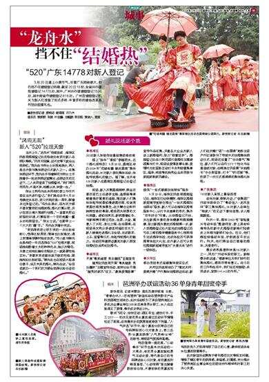 5月20日遇上小满节气,尽管广东雨势颇大,但仍挡不住婚姻登记热潮,截至20日18时,全省共办理结婚登记14778对,其中,广州共办理婚姻登记1598对,其中跨省市婚姻登记616对。广州各婚姻登记机关为新人们准备了形式多样、丰富多彩的婚俗改革系列活动甜蜜礼包。