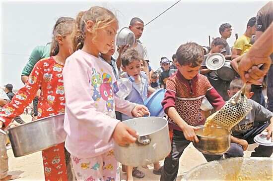 5月19日,在加沙地带南部城市拉法,孩子们等待领取食物。新华社发