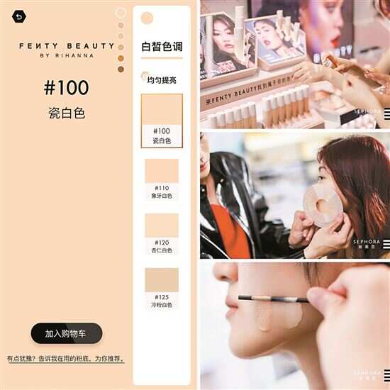 藉Fenty Beauty滤镜大师柔光持久粉底液突破性的50色粉底选择,丝芙兰在320家门店推出Fenty Beauty底妆定制服务,助力求美者找寻真我本色。