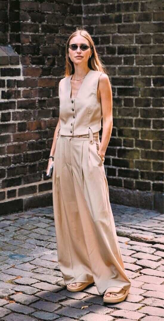 西装马甲单穿时的“V”字领口,很好延伸颈部线条,也有一定的修饰身材作用。较为流行的搭配方式是搭宽松西装裤,二者同属于直线型,版型剪裁搭配起来更显干练利落。也可搭配宽松短裤,夏季更易拗出舒适高级的造型。