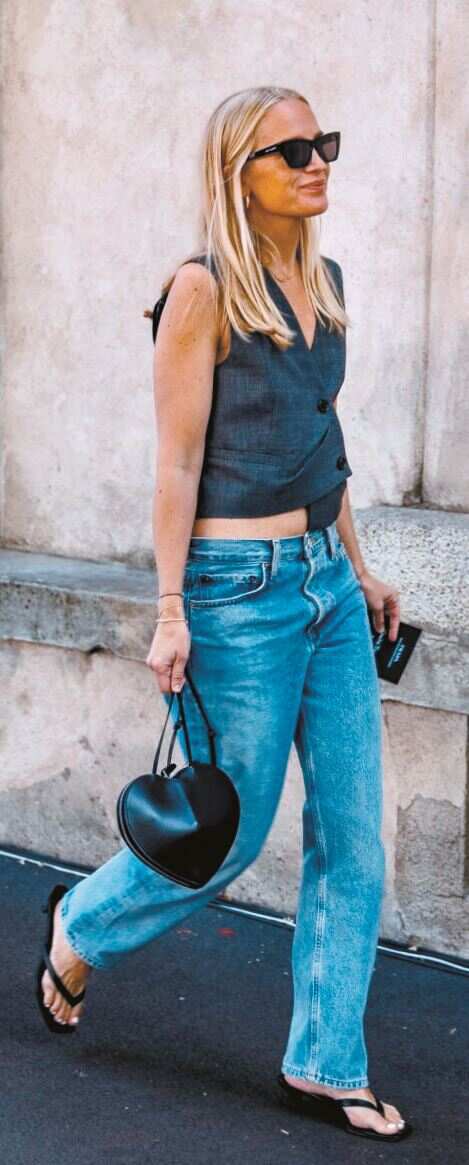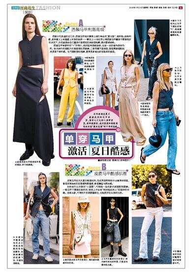 近年逐渐在夏天蔚然成风的马甲单穿,像背心又比背心肩带更宽,面料偏挺括,选对版型和搭配能轻松打造“遮肉显高”的干净利落感。