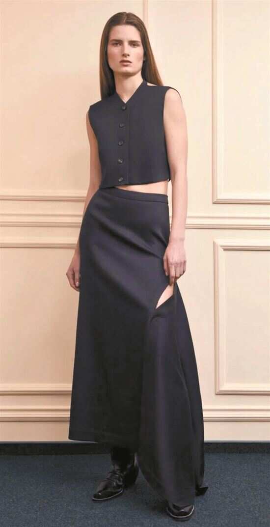 短款西装马甲搭线条利落的裙装,帅与美兼顾。