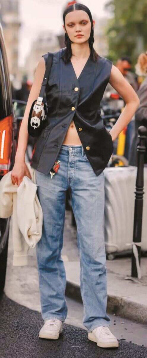如你有引以为傲的“小蛮腰”,可挑短一些的款式或搭配低腰裤。一般马甲下摆是往里收的,视觉上不会有“刚好掐在肉上”而显胖的问题。若是长款,可将扣子扣到腰腹部位,也能更好拉长身材比例。