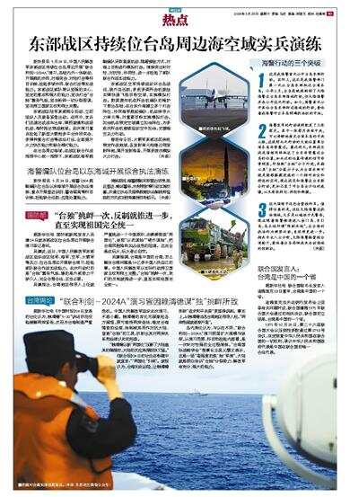 新快报讯 5月24日,中国人民解放军东部战区持续位台岛周边开展“联合利剑-2024A”演习,岛链内外一体联动,开展舰机协同、对海突击、对陆打击等科目训练,检验多域协同、联合打击等实战能力。东部战区部队将以坚强的决心、坚定的意志和强大的能力,坚决打击“台独”嚣张气焰,坚决粉碎一切分裂图谋,坚决捍卫国家主权和领土完整。