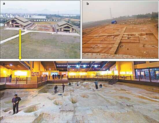 ■上山遗址(a和c)及荷花山遗址(b)的位置(中国科学院地质与地球物理研究所、浙江省文物考古研究所供图)。
