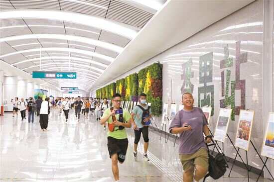 12:00,番禺站等候进闸体验首趟车的乘客排了超过100米的队伍。不少乘客感叹,番禺站最直观的感受就是大,“一眼望不到尽头”。据了解,该车站主体长1194米,站房建筑面积相当于11座标准地铁站。