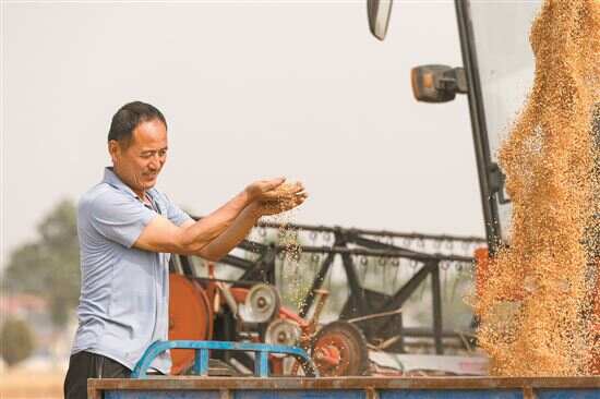 ■5月26日,在河南省商丘市睢县尚屯镇荒庄村,农民查看刚刚收获的小麦。