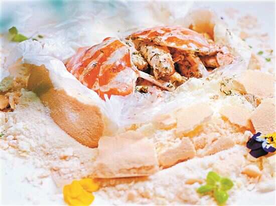 用传统“盐焗”方式烹制花蟹,让蟹的鲜味在盐的加持下更显醇厚;搭配的鲜茴香实属“妙笔”,让这味盐焗蟹吸纳了独特鲜香。