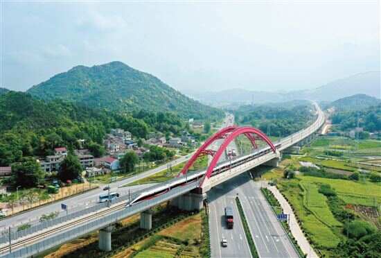 ■列车驶过池州至黄山高铁白沙铺特大桥。新华社(资料图)