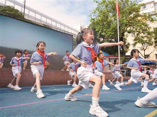 ■2024年海珠区庆祝“六一”国际儿童节活动在邓世昌纪念小学举行,学生们在活动上表演了旗语操、“世昌拳”等节目。新快报记者 郭思杰/摄