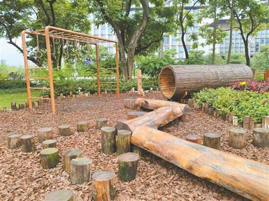 ■云憩里公园里,木桩、树洞、平衡木、吊环等游乐设施设计都突出原木元素。