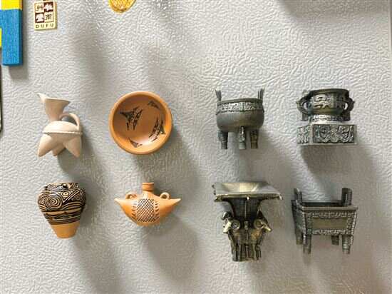 ■小冼收集的两套中国国家博物馆冰箱贴,分别是新石器时代陶器和夏商周青铜器主题。