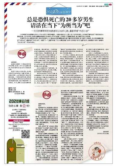 小时候我们总盼望着快点长大,可长大后又不断回味童年。本期来信的主人公是一名20多岁的男生,小时候的“濒死经历”不断在他内心激起涟漪。如今成年后,他更加谨慎地照顾自己的身体,却“杯弓蛇影”,时常陷入对健康的焦虑,难以摆脱对死亡的恐惧。