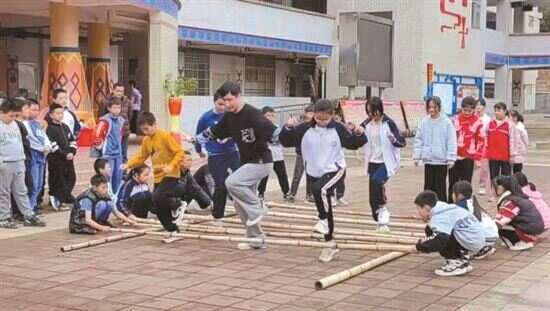 ■华南师范大学舞蹈教研团队在连州市瑶安民族学校教授竹竿舞。
