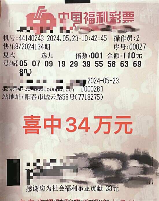 新快报讯 记者陆妍思 通讯员郑惠文报道 中国福利彩票快乐8游戏第2024134期开奖,当期全国中出“选九中九”22注,其中1注花落阳春市城云路58号44140243福彩销售站点。中奖者于先生(化名)以一张“选九中九”复式票中奖,奖金共34.3万元。