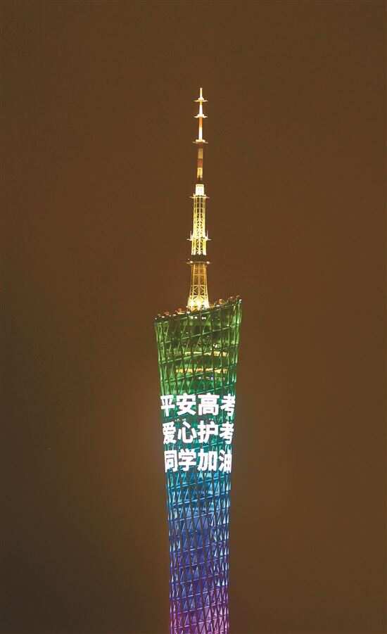 新快报讯 记者邓善雯 见习记者陈钰涵报道 “平安高考,爱心护考,同学加油”。6月6日高考前夕,一则来自广州市招考办的暖心祝福语出现在广州塔上方,为高考生加油鼓劲。